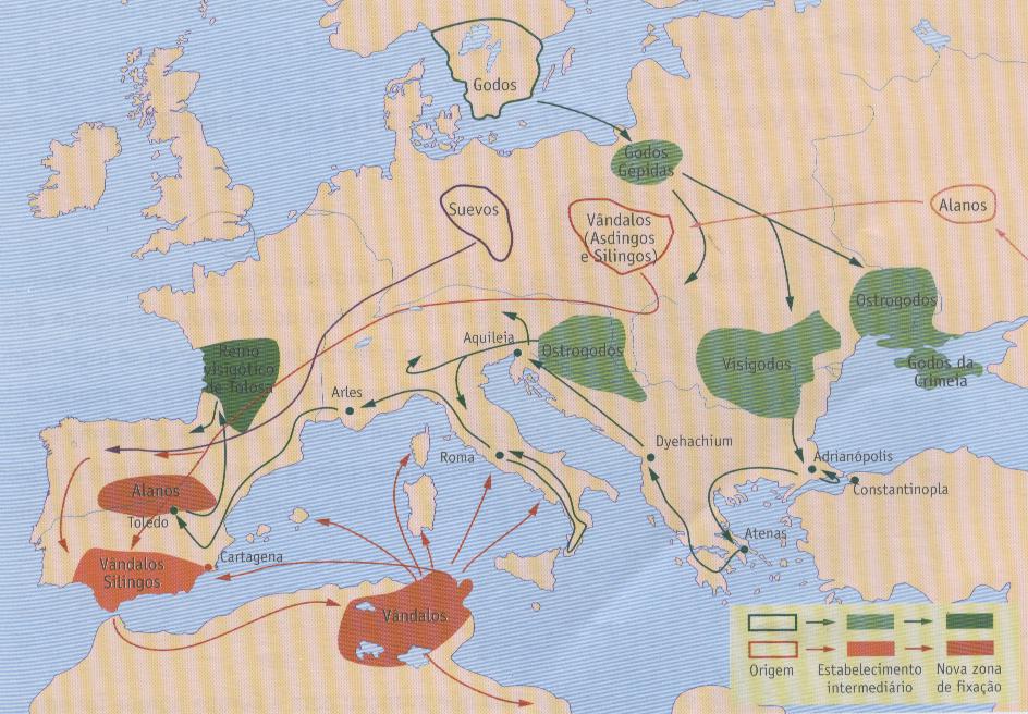 A partir do século III o Império Romano começou a ser invadido por diversos povos vindos do Norte da Europa e do centro da Ásia (os Vândalos, os Alanos, os Suevos e por fim os Visigodos ) .