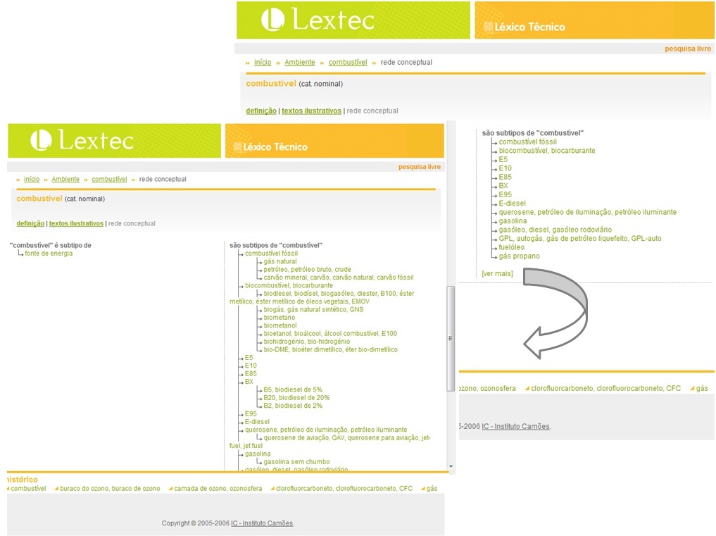 A janela que se abre permite visualizar a rede conceptual associada ao conceito pesquisado, bem como navegar na rede. Por exemplo, quando a expressão seleccionada faça parte de uma subrede com grande profundidade, poderá visualizar mais níveis, tanto de subtipos como de supertipos (sempre que estes estejam disponíveis para o conceito consultado), clicando na expressão [ver mais], tal como apresentado abaixo.